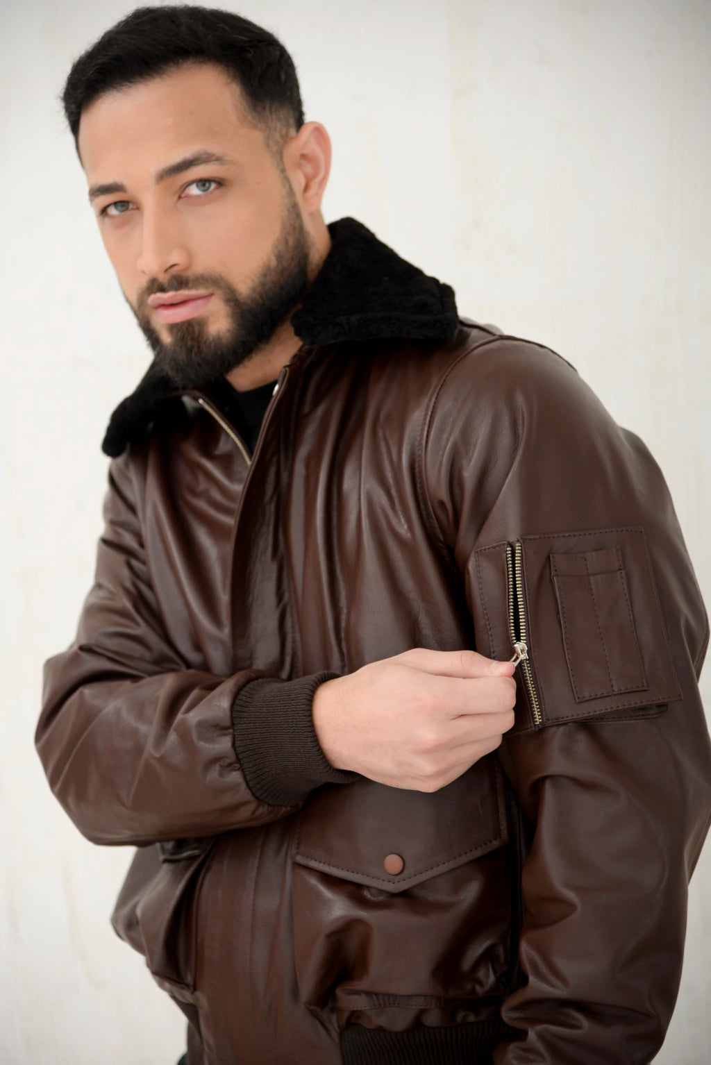 100% cuero vacuno seleccionado. La chaqueta trendy hoy, tipo aviadora y siempre vigente. Cuello camisero y sobre cuello desmontable con cierre de corderito legítimo. Puños y cintura en tejido de punto de primera calidad. Destacados bolsillos delanteros con tapas y broches, dos bolsillos internos, uno con cierre y un bolsillo aviador en la manga izquierda igualmente con cierre y fuelle. Forrería 100% de algodón con mangas en raso satinado. Una campera superior para cualquier ocasión.